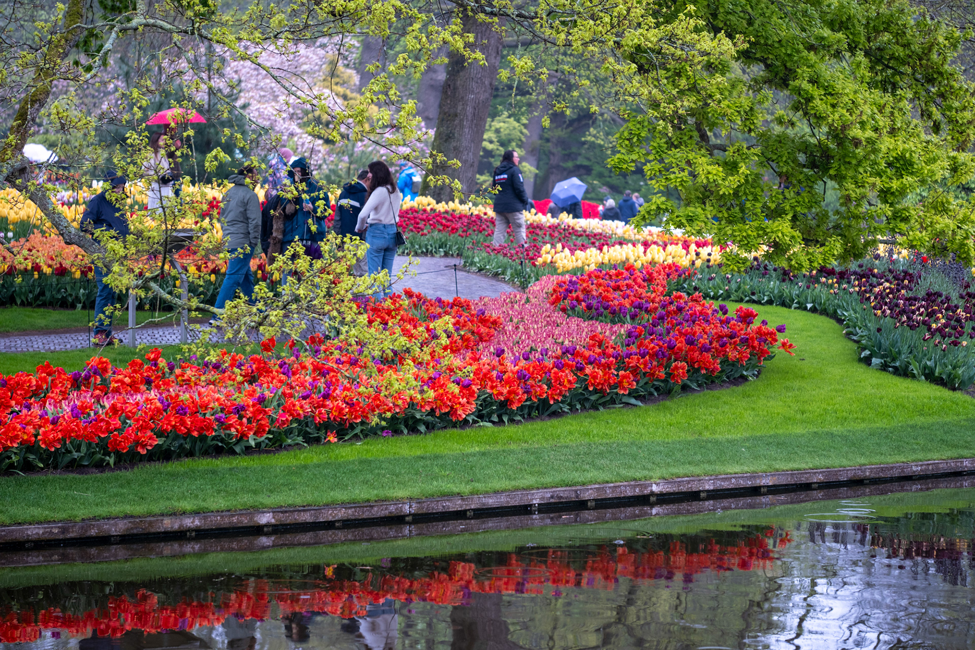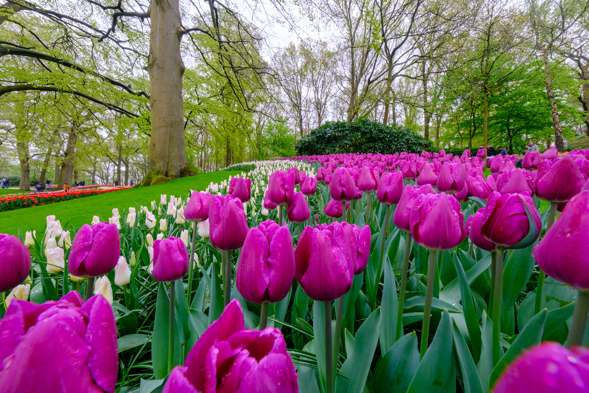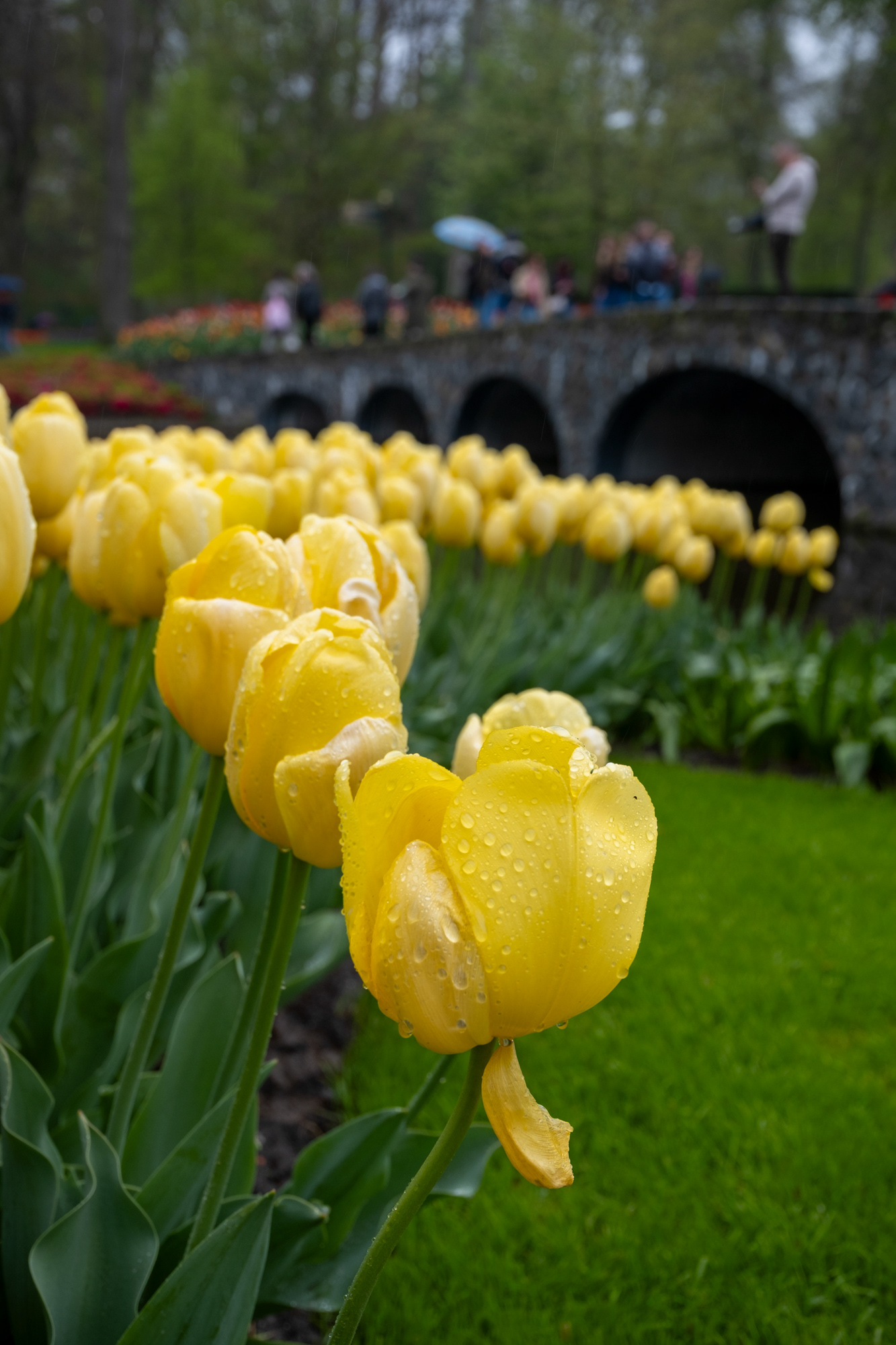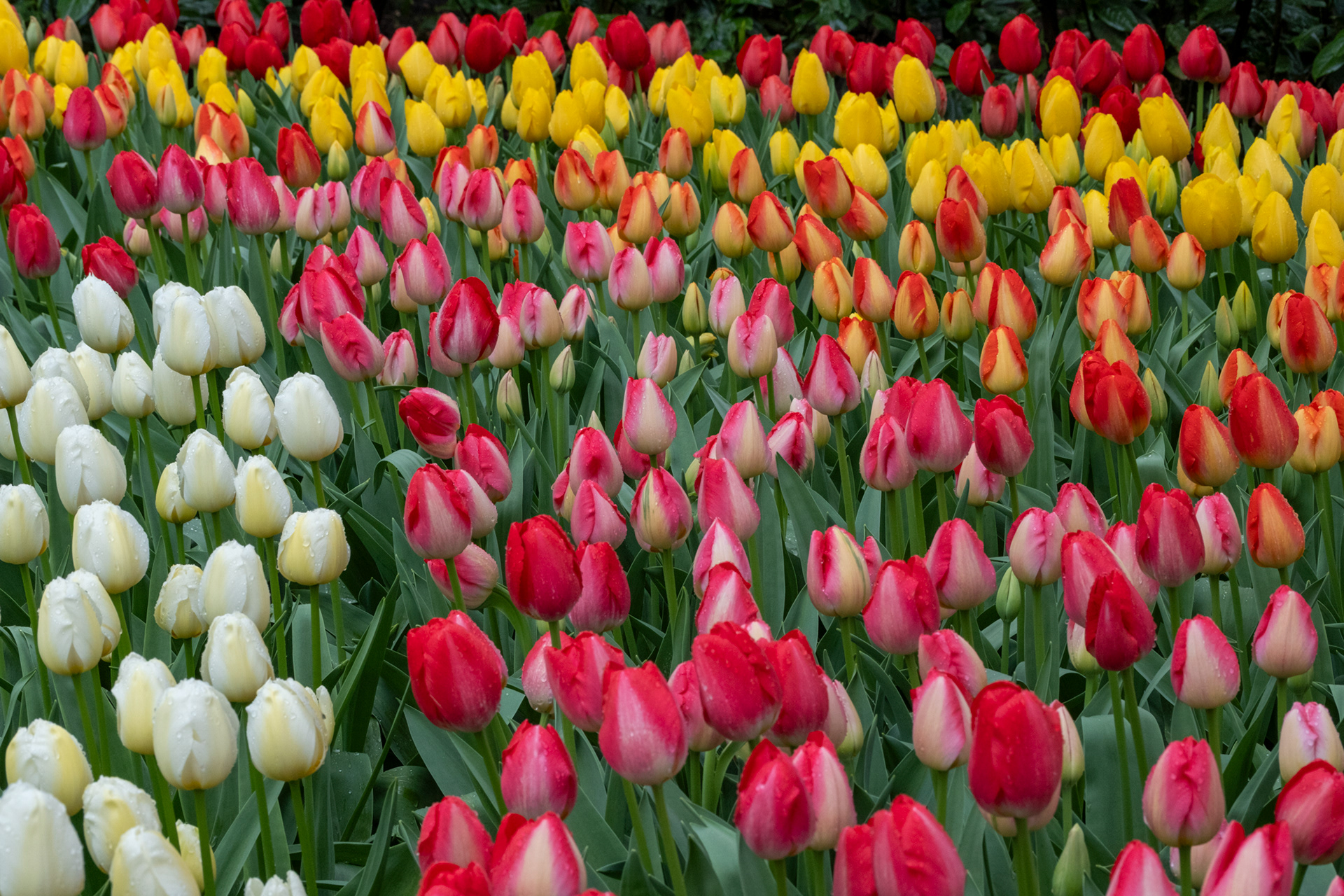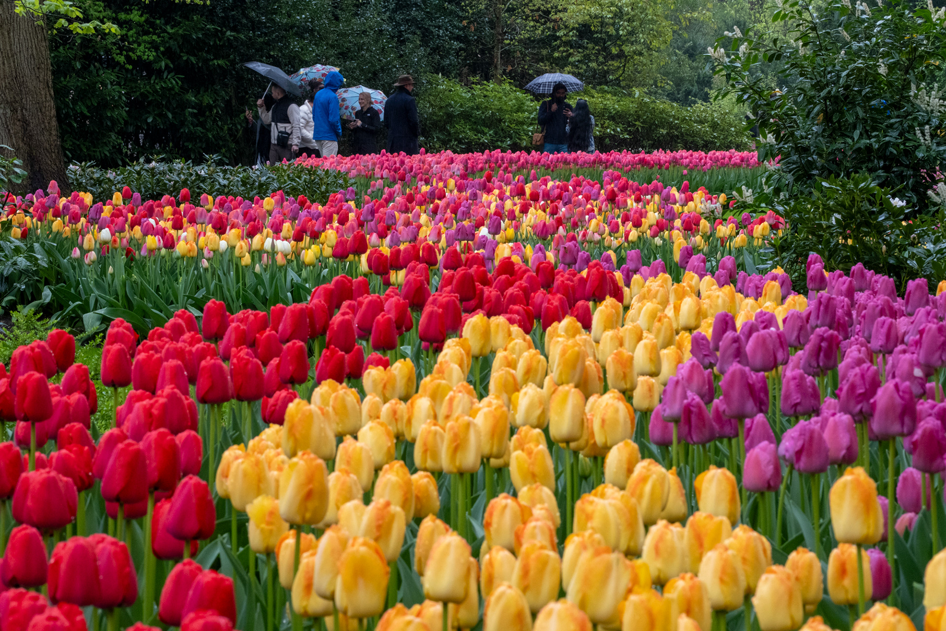 Our second day was rainy with very small crowds as we went when the park opened. Many of the tulips were closed. What a difference! Click on any image to see larger and begin slideshow.