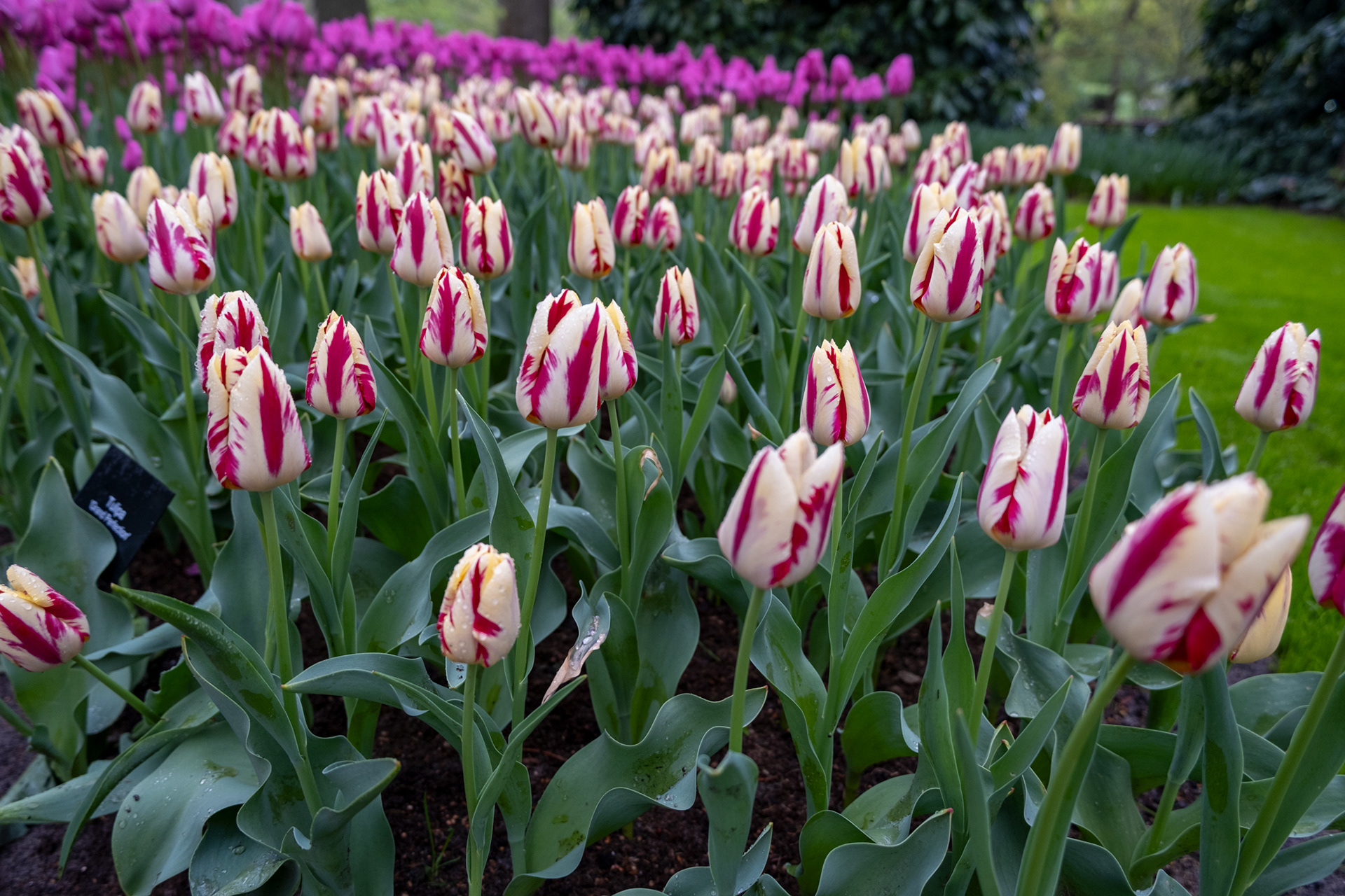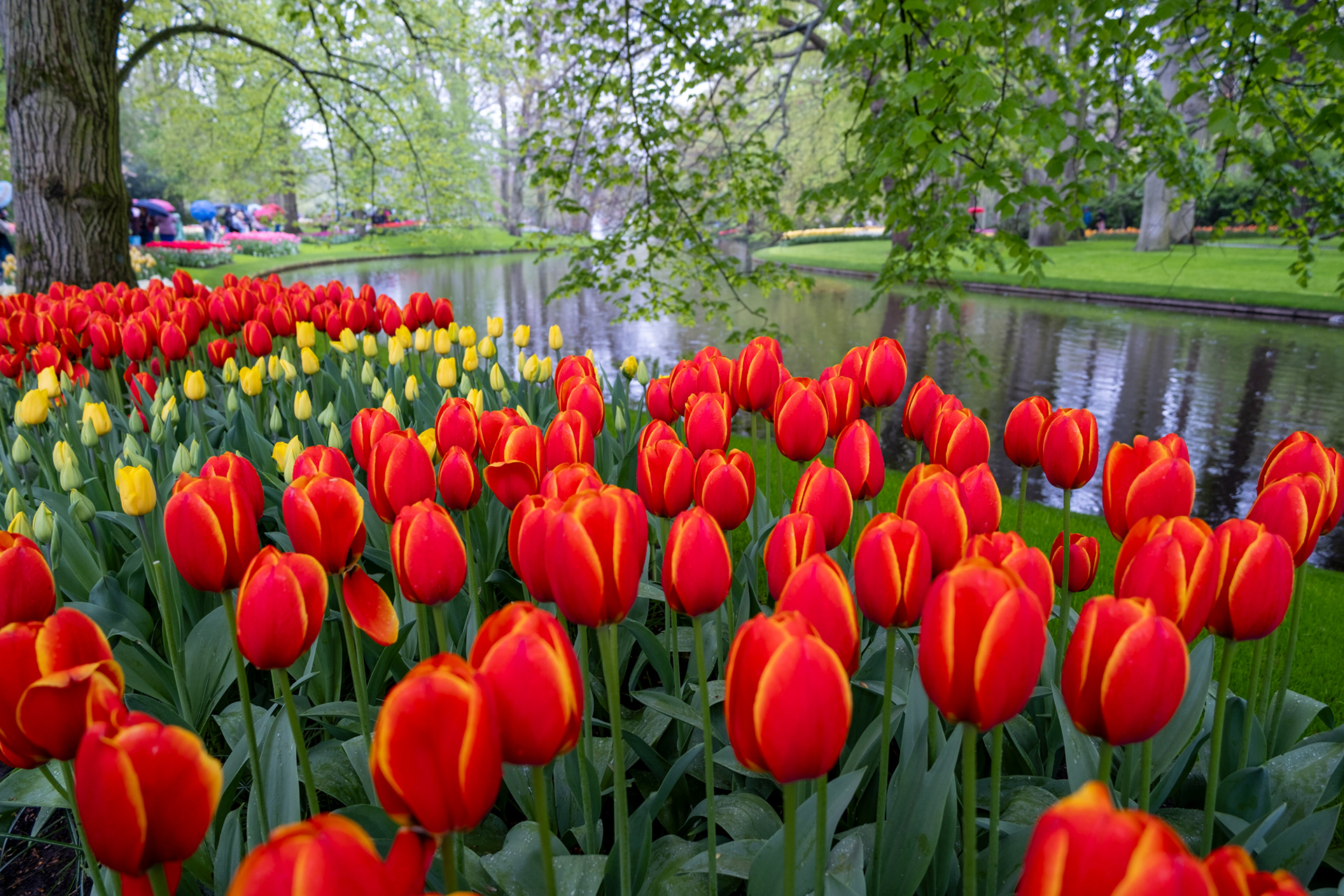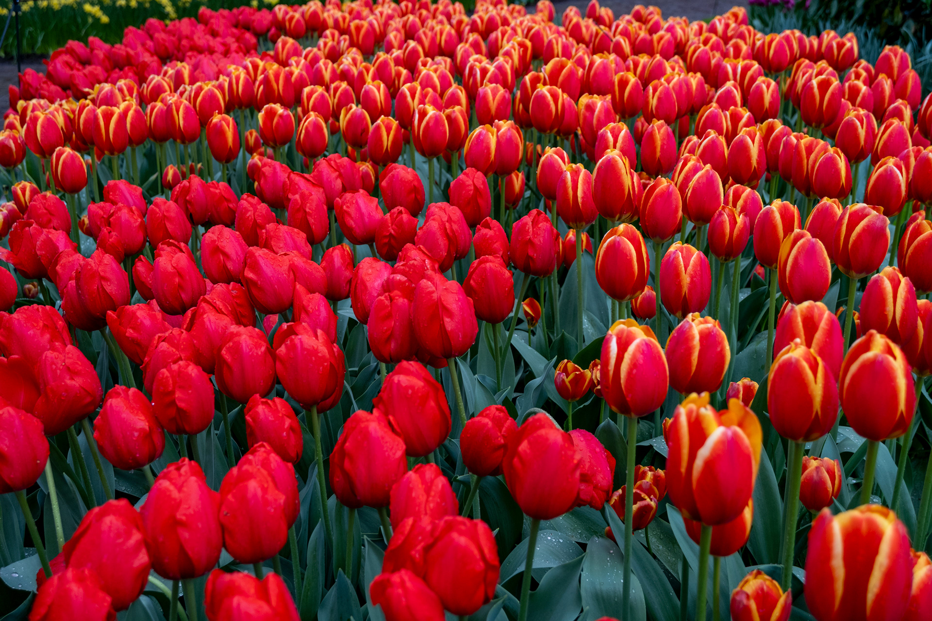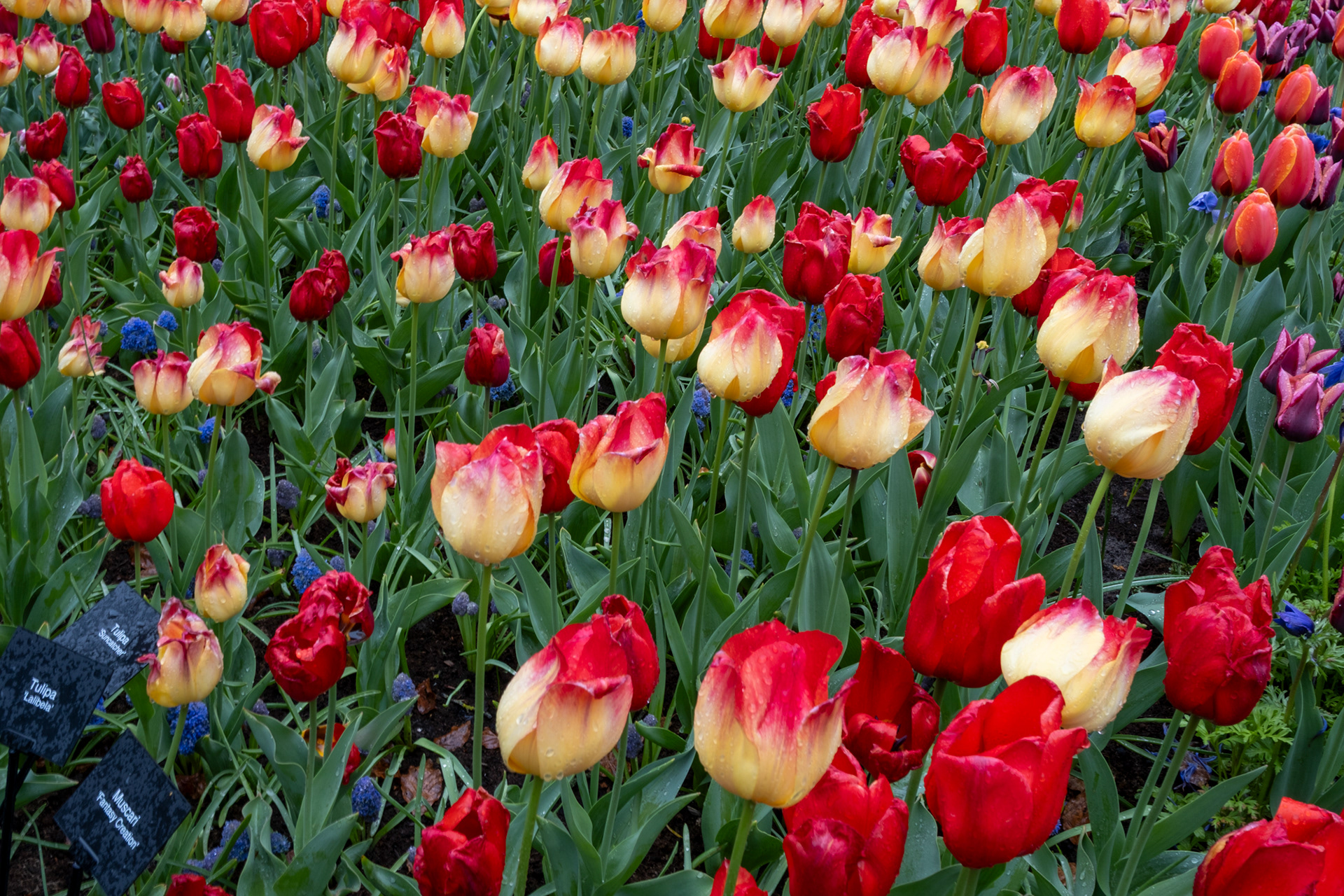 Our second day was rainy with very small crowds as we went when the park opened. Many of the tulips were closed. What a difference! Click on any image to see larger and begin slideshow.